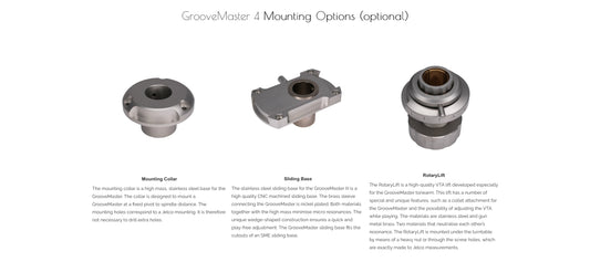 The mounting collar is a high mass, stainless steel base for the GrooveMaster. The collar is designed to mount a GrooveMaster at a fixed pivot to spindle distance. The mounting holes correspond to a Jelco mounting. It is therefore not necessary to drill extra holes.